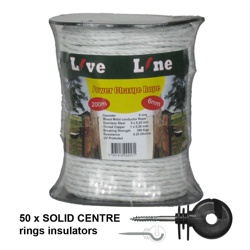 This is a bundle deal with our Power Charge electric fencing rope and solid centre ring insulators to screw into fence posts. The choices are 200m of rope with 50 rings or 400m of rope with 100 ring insulators.