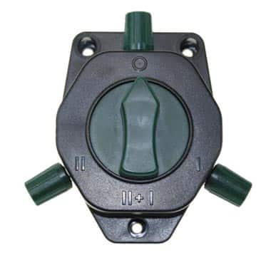 The switch has an input for the power from the energiser and two outlets for connecting seperate sections of electric fencing. Ideal for use with mains fencers which are usually located indoors, as you can just switch the fencing on or off from the field.