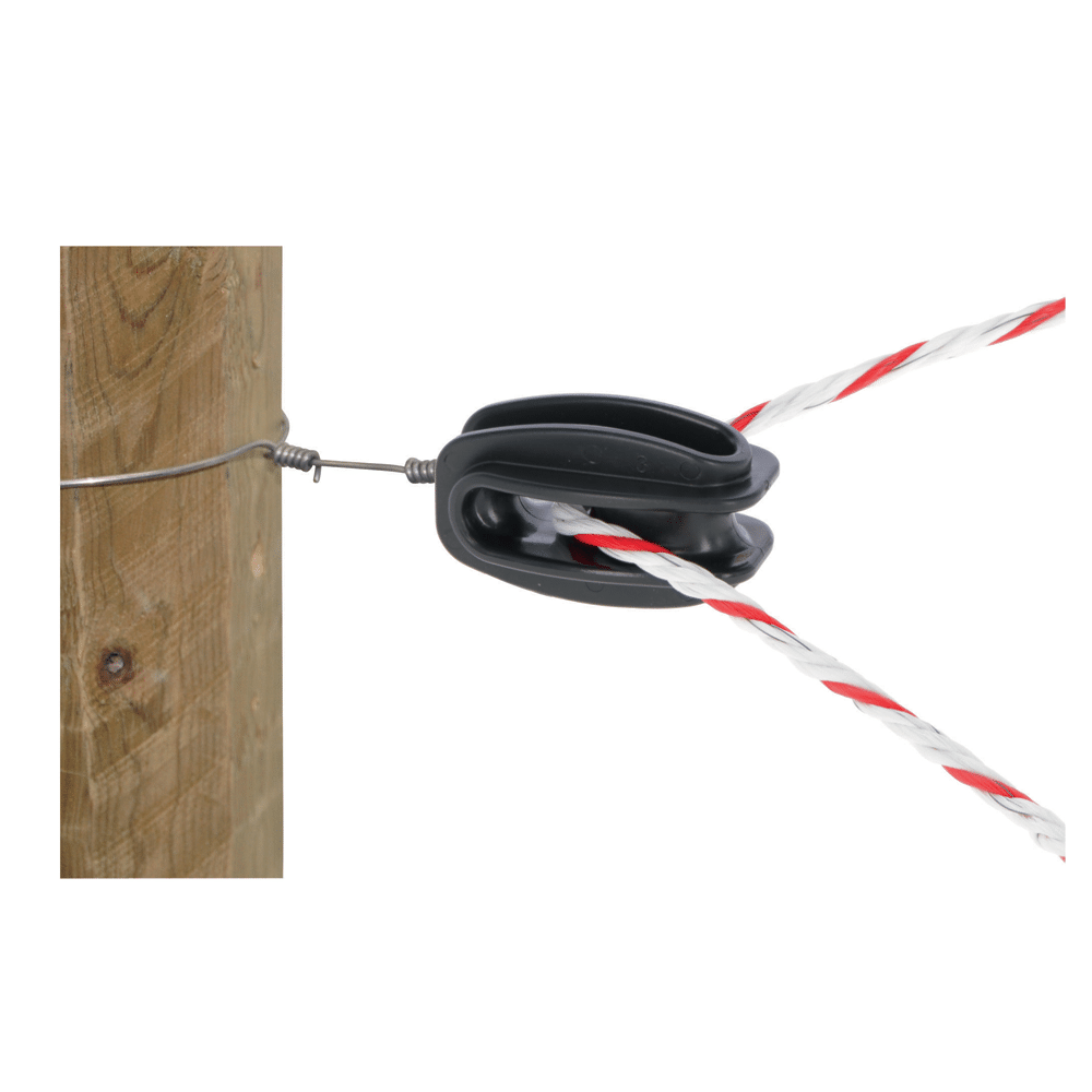 These are heavy duty plastic corner insulators for wire, twine and rope electric fencing. They can be tied back to a corner straining post and the conducting wire or rope threaded through in order for the conductor to change direction at a field corner without causing wear on the steel conductors.