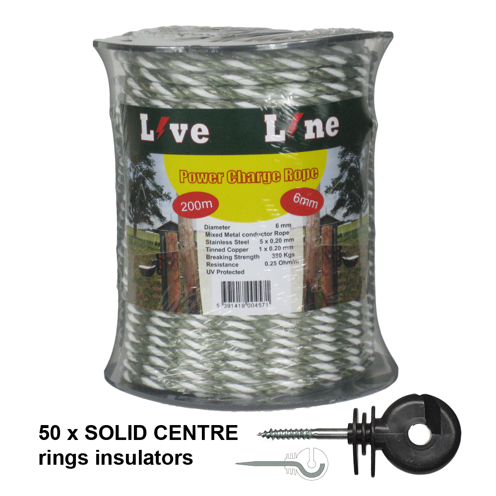This is a bundle deal with our Power Charge electric fencing rope and ring insulators to screw into wooden fence posts. The choices are 200m of rope with 50 rings or a 400m roll of rope and 100 ring insulators.