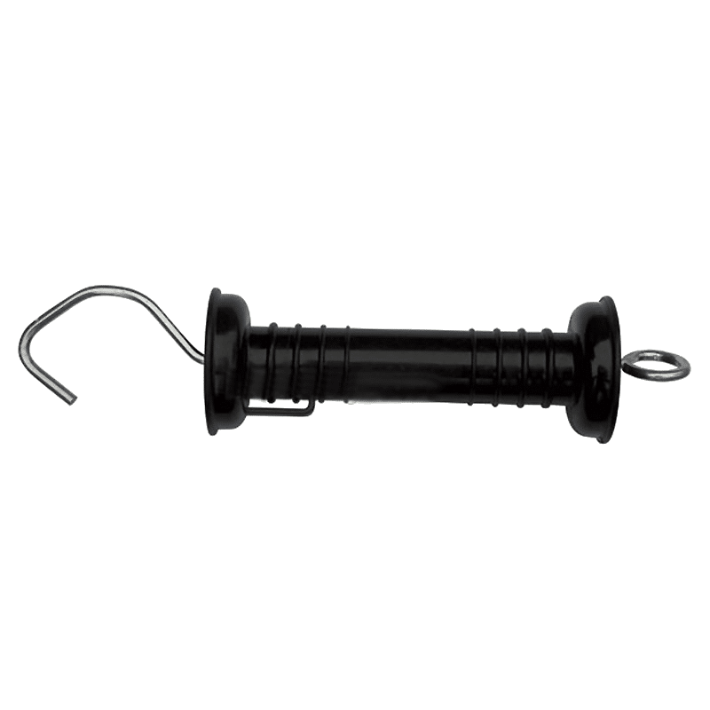 The Farmer gate handle is a very robust handle with a strong plastic grip and an internal compression spring. There is a strong fixed hook for latching on to a gate handle insulator and a circular hook at the other end for attaching the fence line.