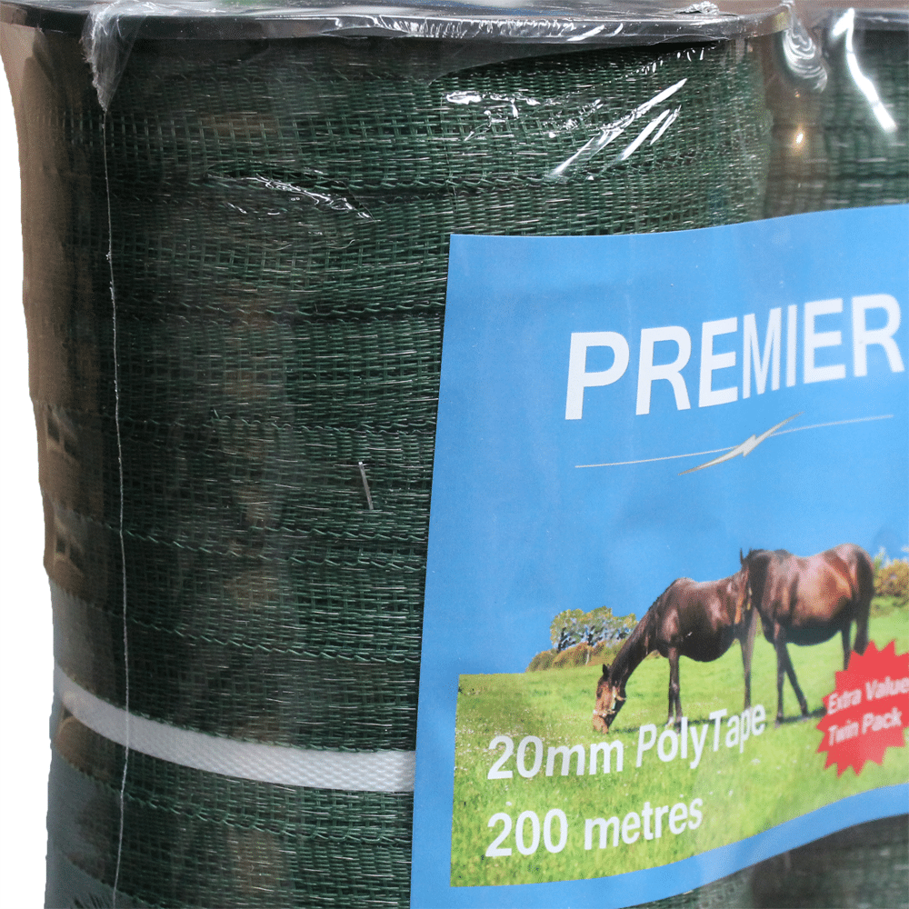 This twin-pack contains 2 rolls of green Premier 20mm poly-tape for electric fencing. Each roll of tape is 200m long and 20mm wide with 4 stainless steel conductors (0.16mm diameter) running through them – ideal for medium length fences.