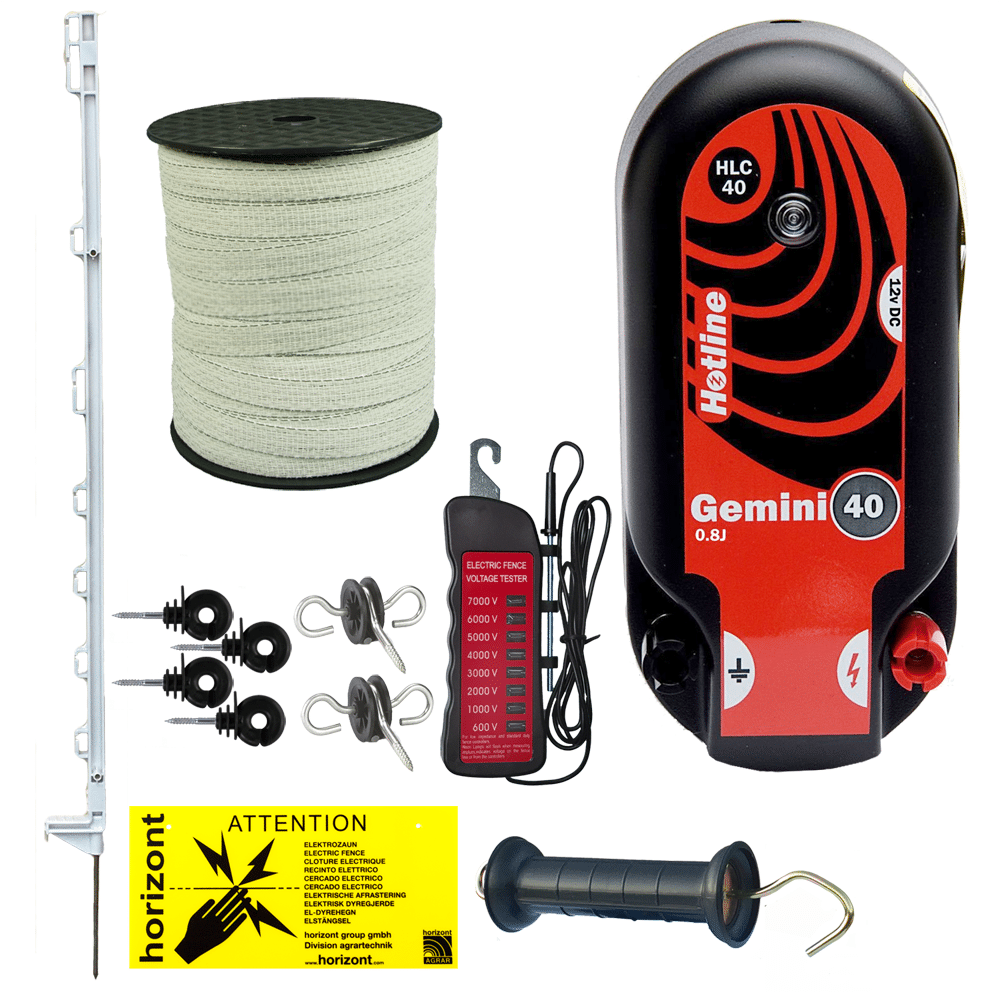 This is an electric fencing kit for horses with a versatile mains or 12v battery powered Gemini energiser. The kit is supplied with a Gemini 40 as standard, with an output joule rating of 0.4 joules this is suitable for medium length fencing and will power up to 4km with a 3,900v pulse under normal line resistance levels of 500 ohms.