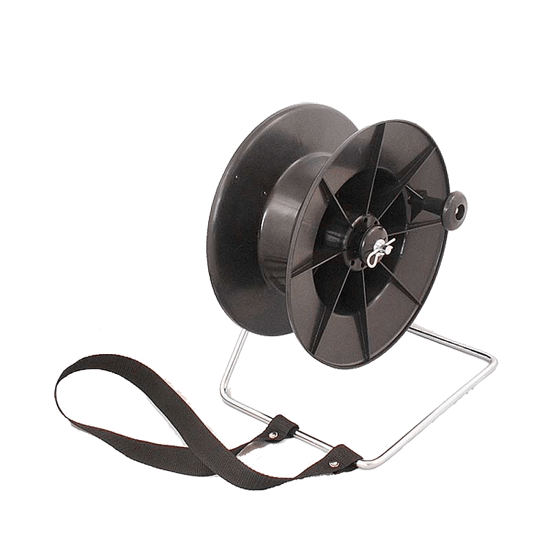 The strap goes over your head and the steel bracket rests against your chest when winding in or reeling out which saves your arms getting tired. The reel can be left freestanding safely in the field as there is a brake so your conductor will not unroll itself when your back’s turned.