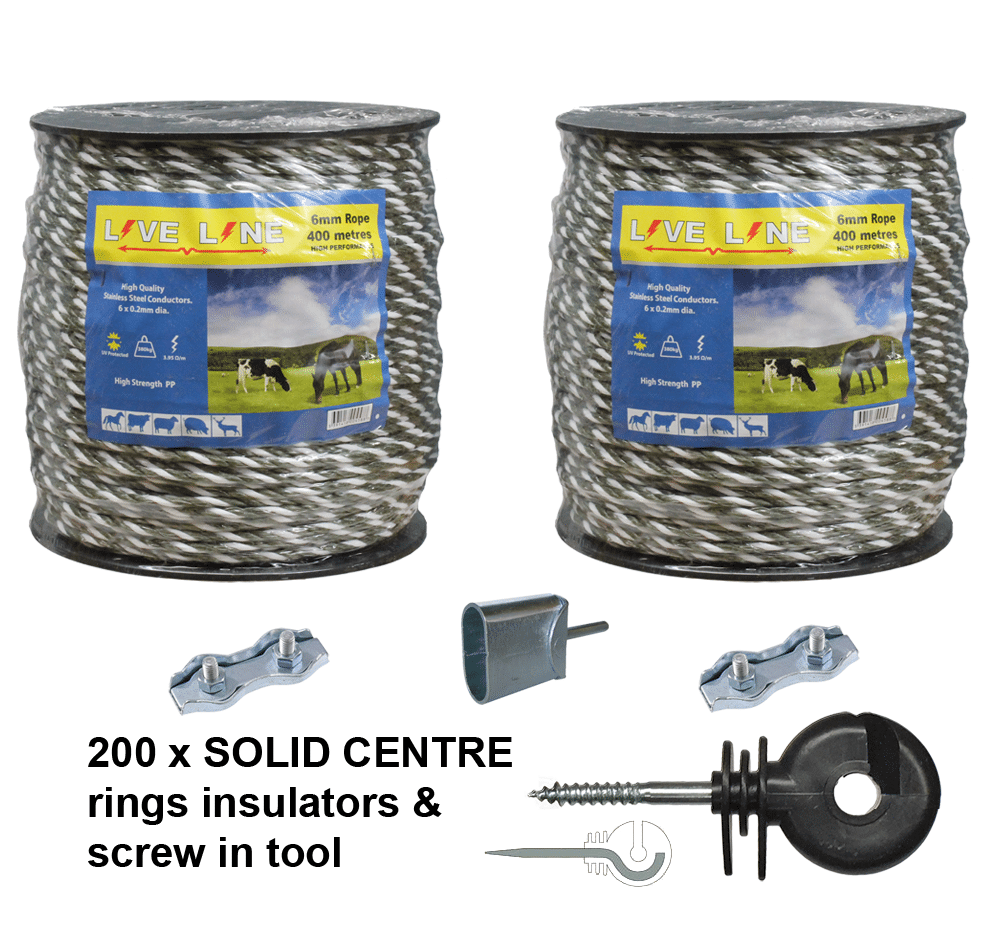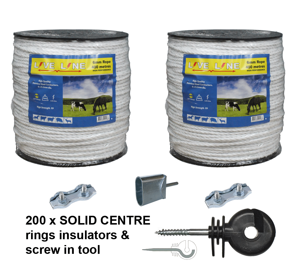 2 x 400m Rope with 200 Ring insulators, free screw in tool and 2 rope connectors