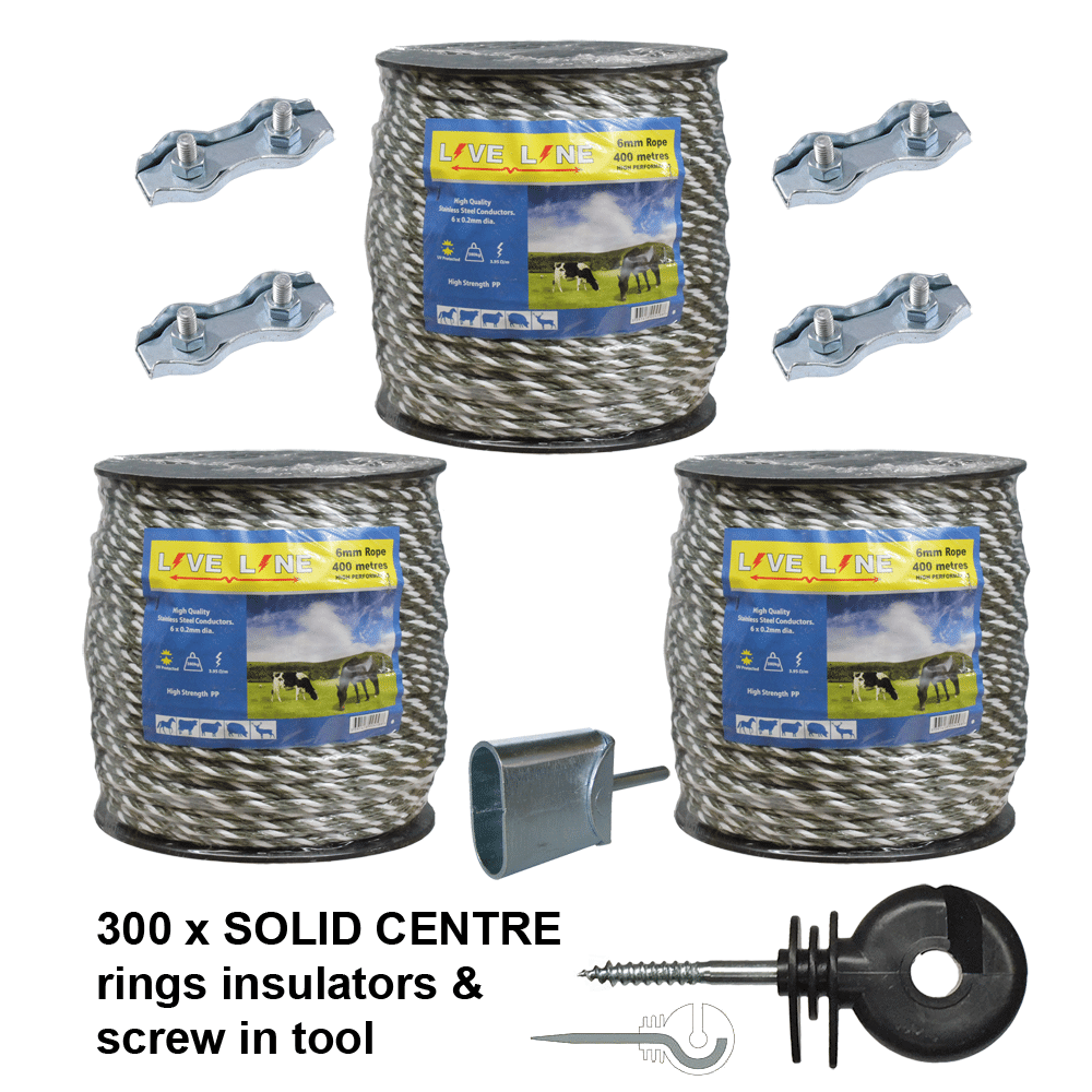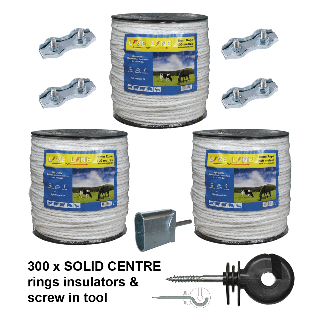 3 x 400m Rope with 300 Ring insulators, free screw in tool and 4 rope connectors