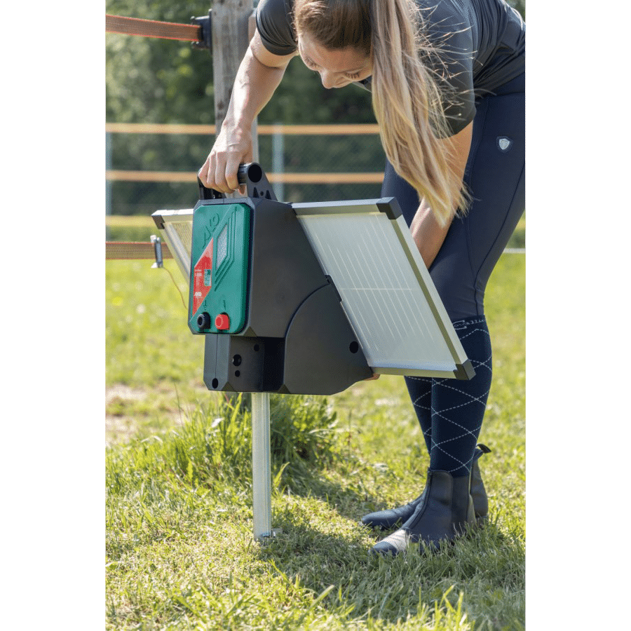 This integrated unit has a 30w solar panel array on the front which charges the internal 12v battery (18Ah) during daylight hours. The energiser, mounted on the rear, takes it’s power from the internal battery and puts the pulse down the fenceline. The battery can be removed to recharge in winter months, should it be necessary, and charging leads for that are provided.
