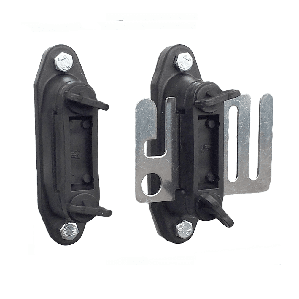 These are a couple of insulators which bolt onto steel gateposts to make a secure opening in a tape fence. Both are strong insulators that can take up to 40mm tape. They will keep your gates looking tidy and as there are no knots, all the power from your fence wil be transferred from one side of the gate to the other.