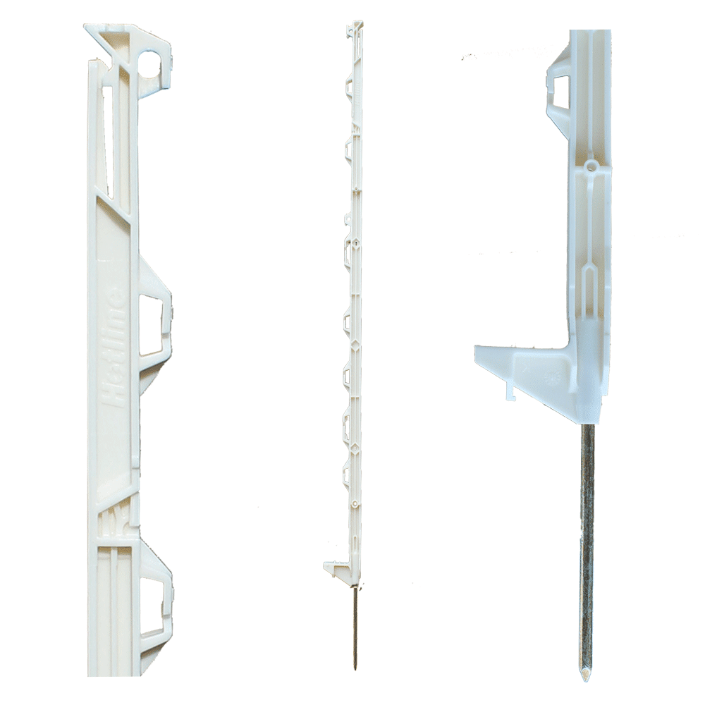 These white plastic electric fence posts are 105cm tall with 90cm above ground, holding the top line of the fence about 3′ high. There are 10 insulators in total with 5 for 20mm tape, 3 holders for 40mm tape and 2 insulators for rope. The main difference about this moulding is that there is both a rope insulator and a slot for 40mm tape right at the top.